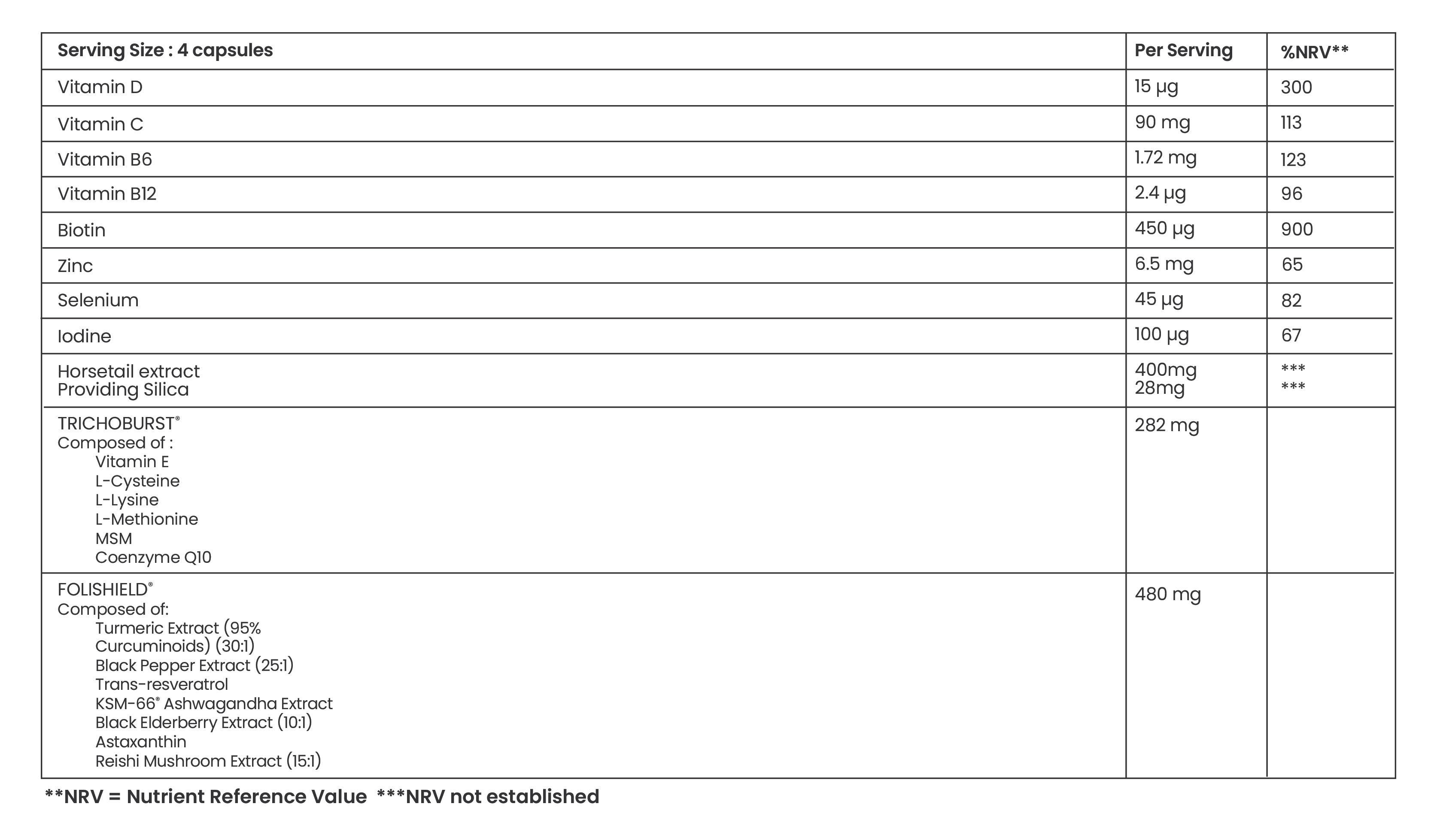 Bulking Agent (Cellulose), Capsule Shell (Hydroxypropyl Methyl Cellulose), Horsetail Extract Preparation (Equisetum arvense), Turmeric Extract (Curcuma longa) 50:1, Methylsulphonylmethane (MSM), Haematococcus pluvialis Powder (Astaxanthin), Ashwagandha Root Extract (Withania somnifera), Ascorbic Acid, Anti-caking Agents (Silicon Dioxide, Magnesium Stearate), Maltodextrin, L-Cysteine Hydrochloride, L-Lysine Monohydrochloride, CoEnzyme Q10, L-Methionine, Black Elderberry Extract (Sambucus nigra) 10:1, Zinc Oxide, Vitamin D3 Preparation (Cholecalciferol), Reishi (Ganoderma lucidum) 15:1, Trans-resveratrol (Polygonum cuspidatum), D-Alpha Tocopherol Acid Succinate, Pyridoxine Hydrochloride, Biotin, Black Pepper Extract (Piper nigrum) 25:1, Potassium Iodide, Sodium Selenite, Cyanocobalamin Preparation.