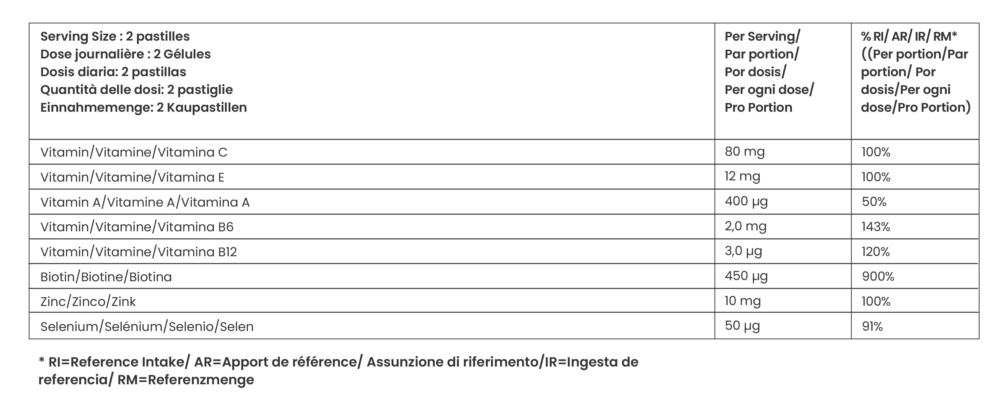 Glucose syrup, sugar, modified potato starch, Vitamin C (as L-ascorbic acid), acid: citric acid, sweet potato, apple, radish and cherry concentrate, natural flavouring, vegetable oil (coconut, canola), glazing agent: carnauba wax, zinc gluconate, Vitamin E (as dl-alpha tocopheryl acetate), Vitamin B6 (as pyridoxine hydrochloride), Vitamin A (as retinyl acetate), D-biotin, sodium selenate, Vitamin B12 (as cyanocobalamin).