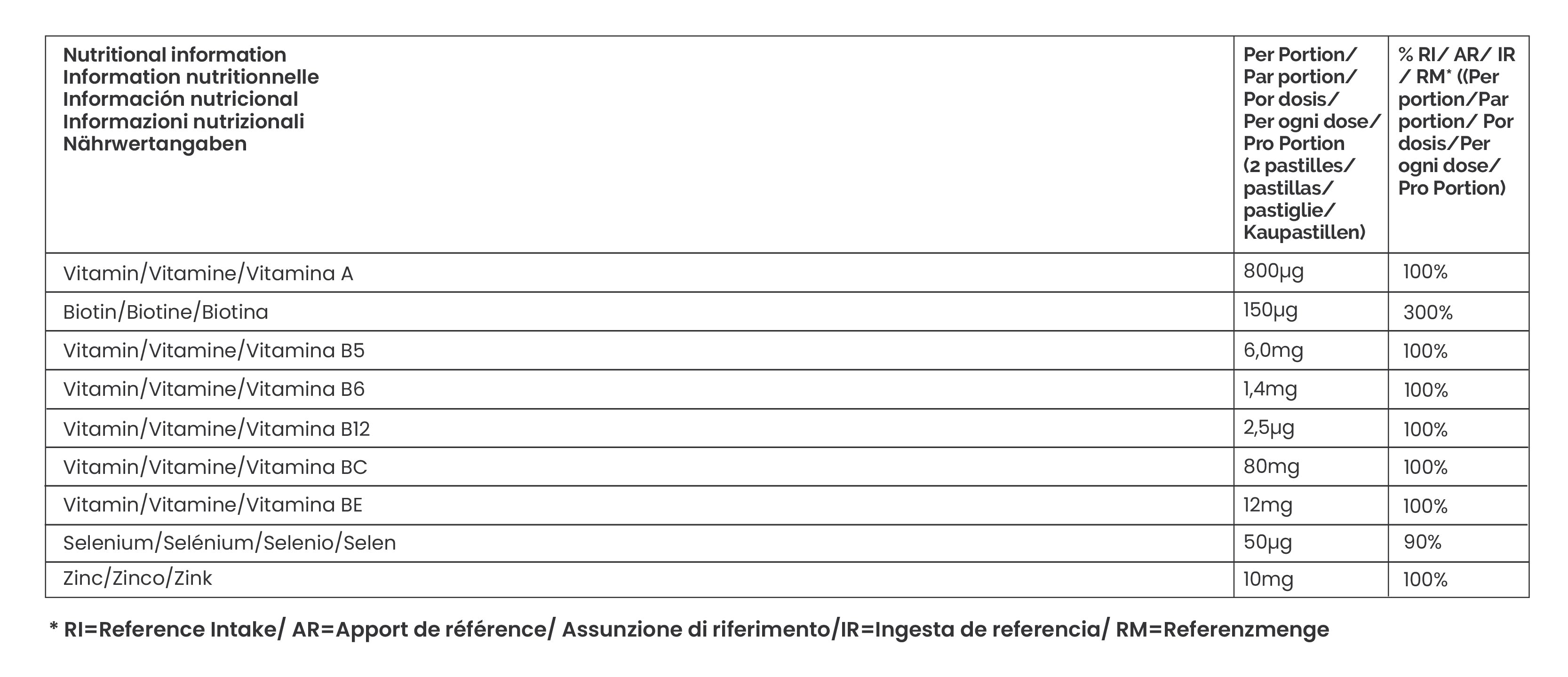 Glucose syrup, sugar, gelatin (bovine), blend of vitamins and minerals (zinc gluconate, calcium-L-ascorbate (Vitamin C), L-ascorbic acid (Vitamin C), DL-alpha-tocopheryl acetate (Vitamin E). D-calcium pantothenate (Vitamin B5), retinyl acetate (Vitamin A), cyanocobalamin (Vitamin B12), pyridoxine hydrochloride (Vitamin B6), D-Biotin (Vitamin B8), sodium selenite), natural strawberry flavoring, acid (malic acid), coloring food (concentrate of paprika, carrot and blackcurrant), natural blackcurrant flavouring with other natural flavourings, vegetable oil (coconut, rapeseed), sweetener (steviol glycosides), glazing agent (carnauba wax).
